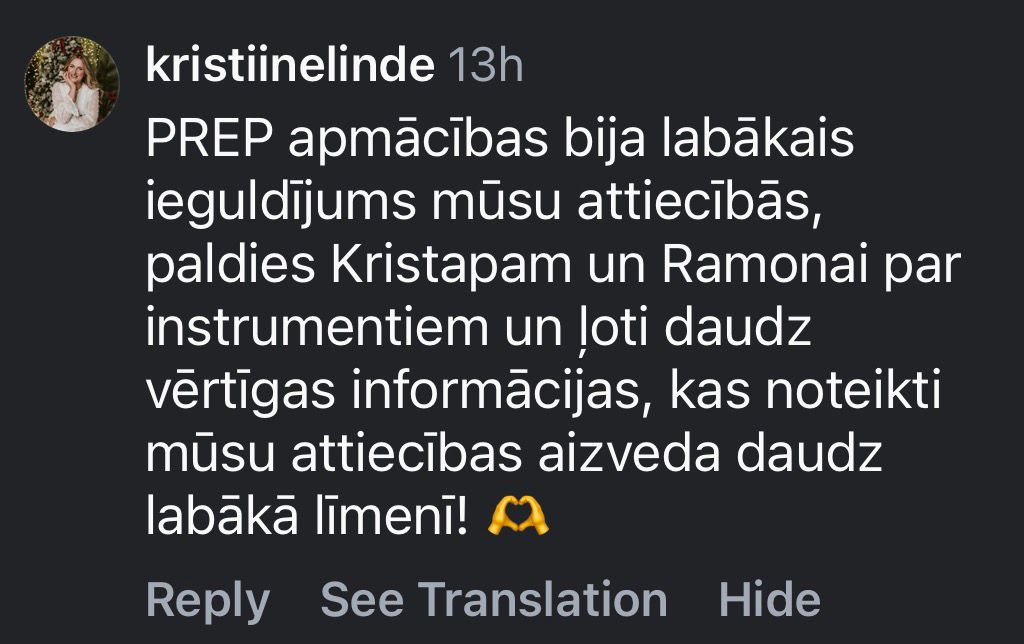 PREP attiecību izglītības kursā tiek saprotami un strukturēti izskaidroti zinātnē balstīti aspekti, kas veido veiksmīgas un veselīgas attiecības. Pēc apmācībām 70% pāru uzlabojas apmierinātība ar attiecībām!